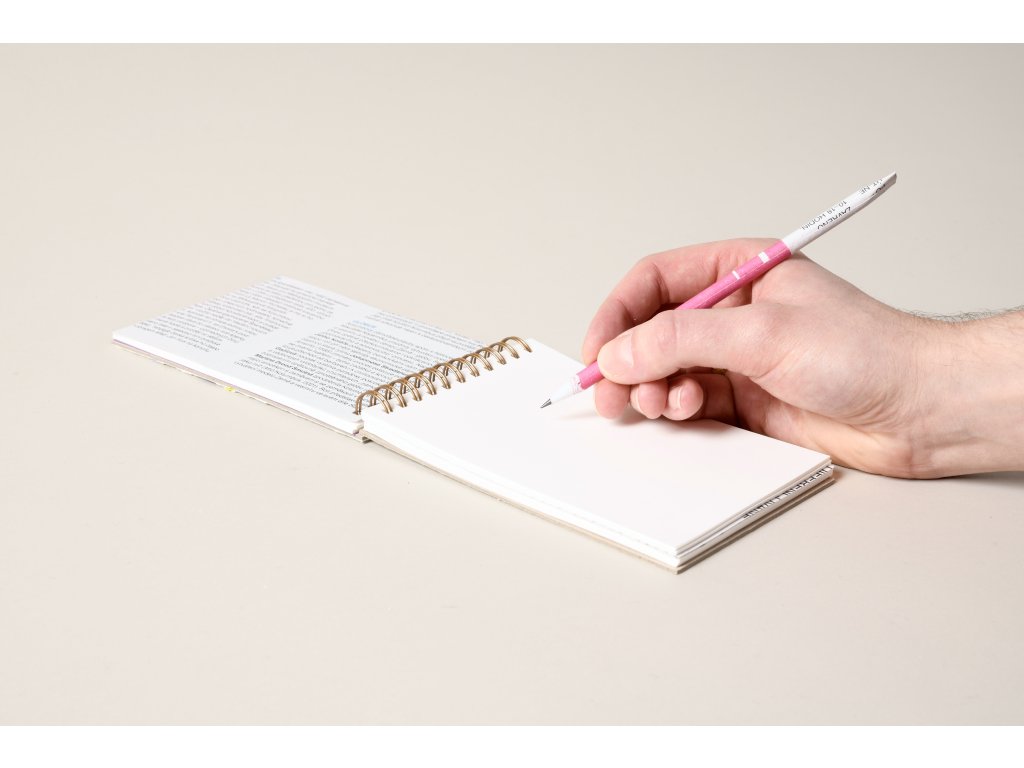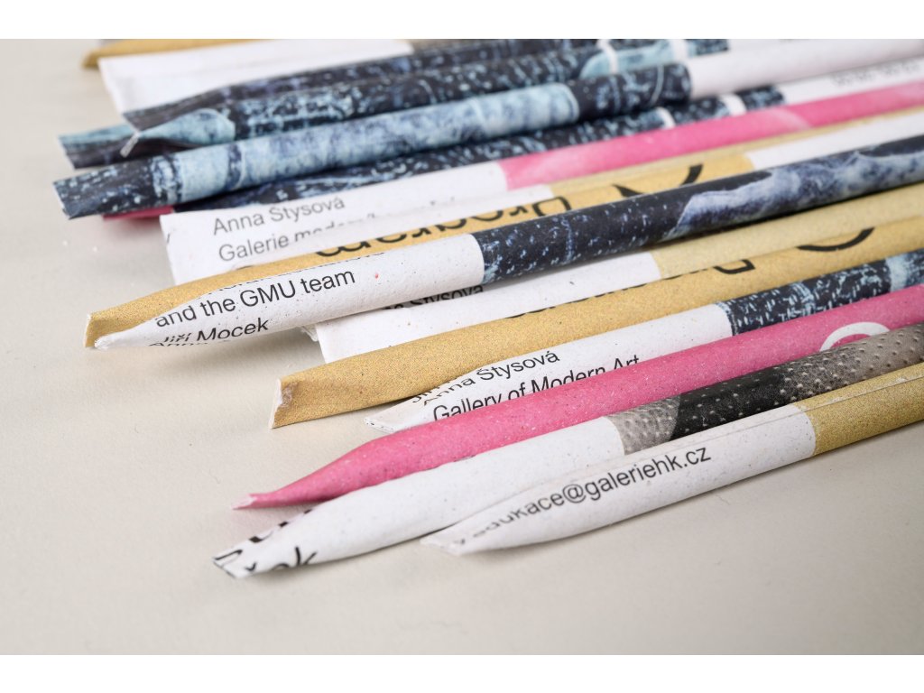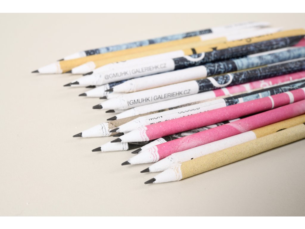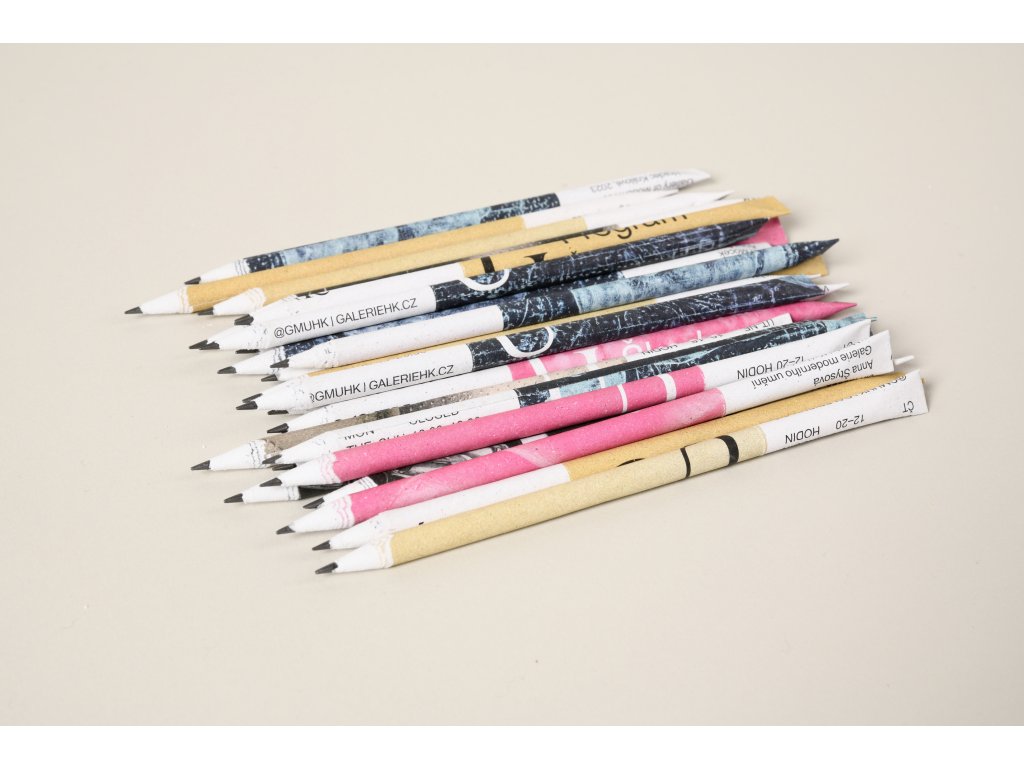 Recyklovaná tužka ze starých tiskovin Galerie moderního umění v Hradci Králové, které tak dostaly nový život. Pro výrobu tužky byly využity staré tiskoviny doprovázející uplynulé výstavy.
